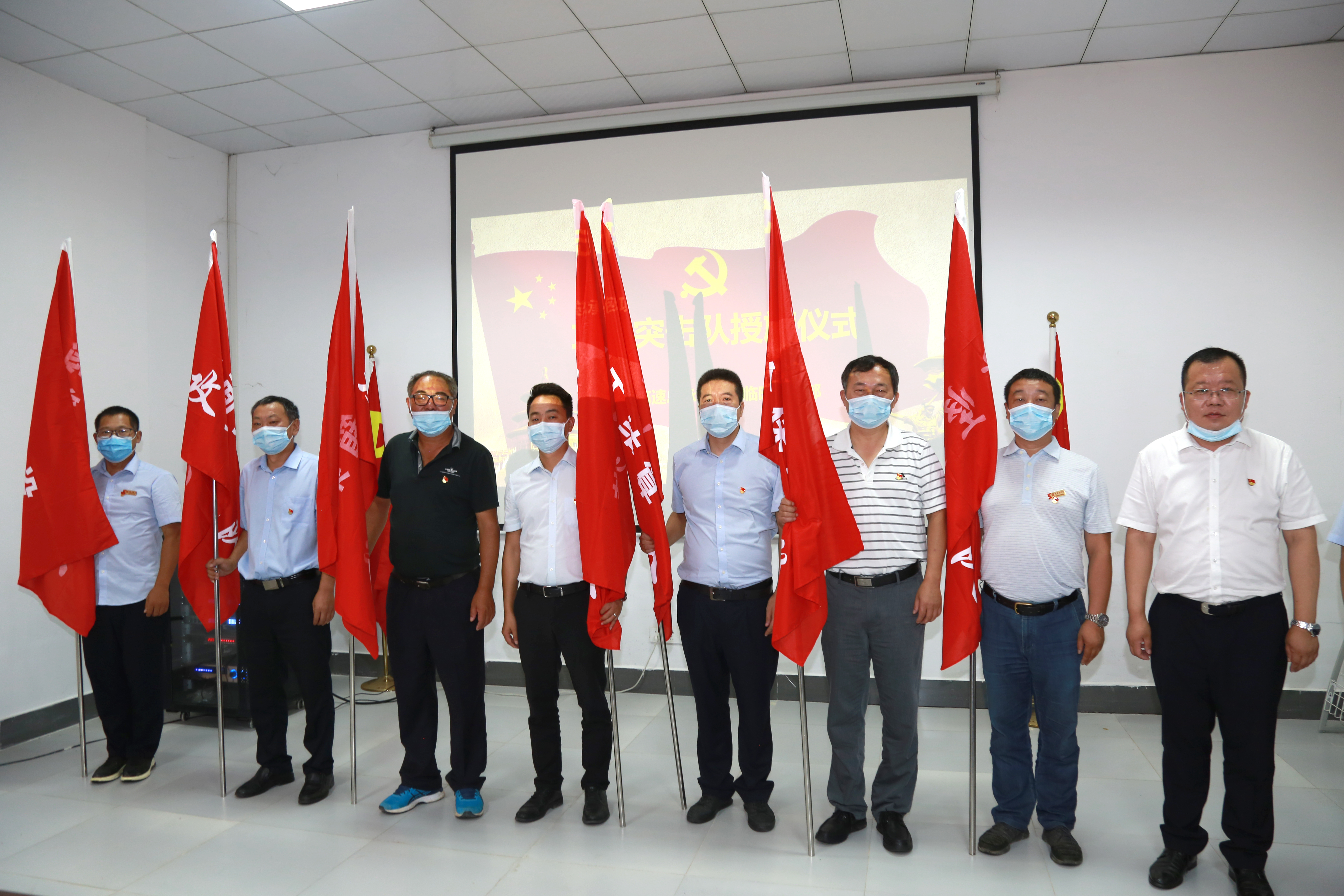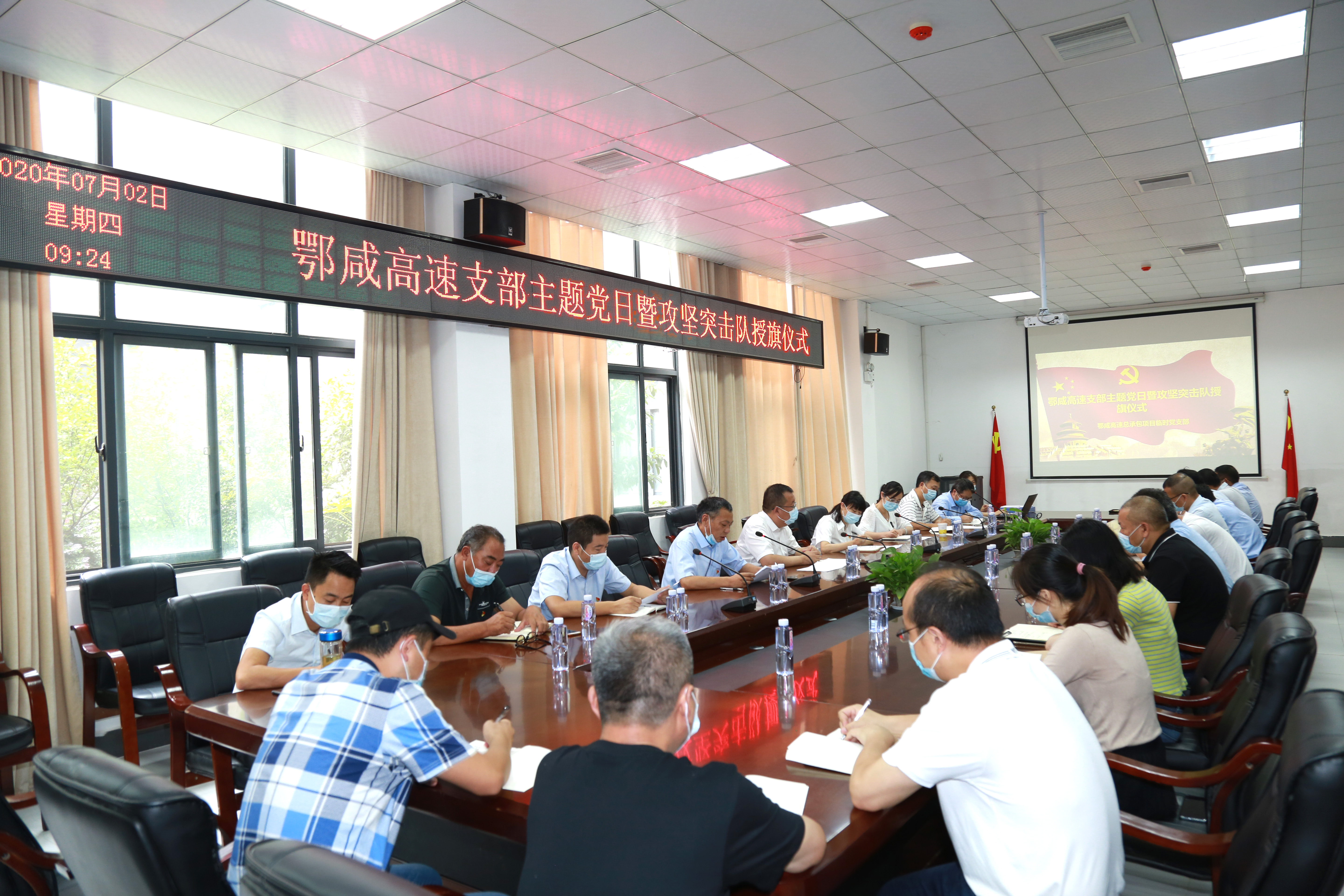 7月2日上午,湖北路橋鄂咸項(xiàng)目臨時(shí)黨支部組織開展慶“七一”主題黨日活動(dòng)暨攻堅(jiān)突擊隊(duì)授旗儀式,隆重慶祝建黨99周年,動(dòng)員項(xiàng)目全體黨員干部進(jìn)一步凝心聚力、銳意進(jìn)取、積極投身到鄂咸項(xiàng)目建設(shè)之中。項(xiàng)目臨時(shí)黨支部32名黨員在主會(huì)場參加,各攻堅(jiān)突擊隊(duì)非黨員隊(duì)員通過視頻形式參加會(huì)議。