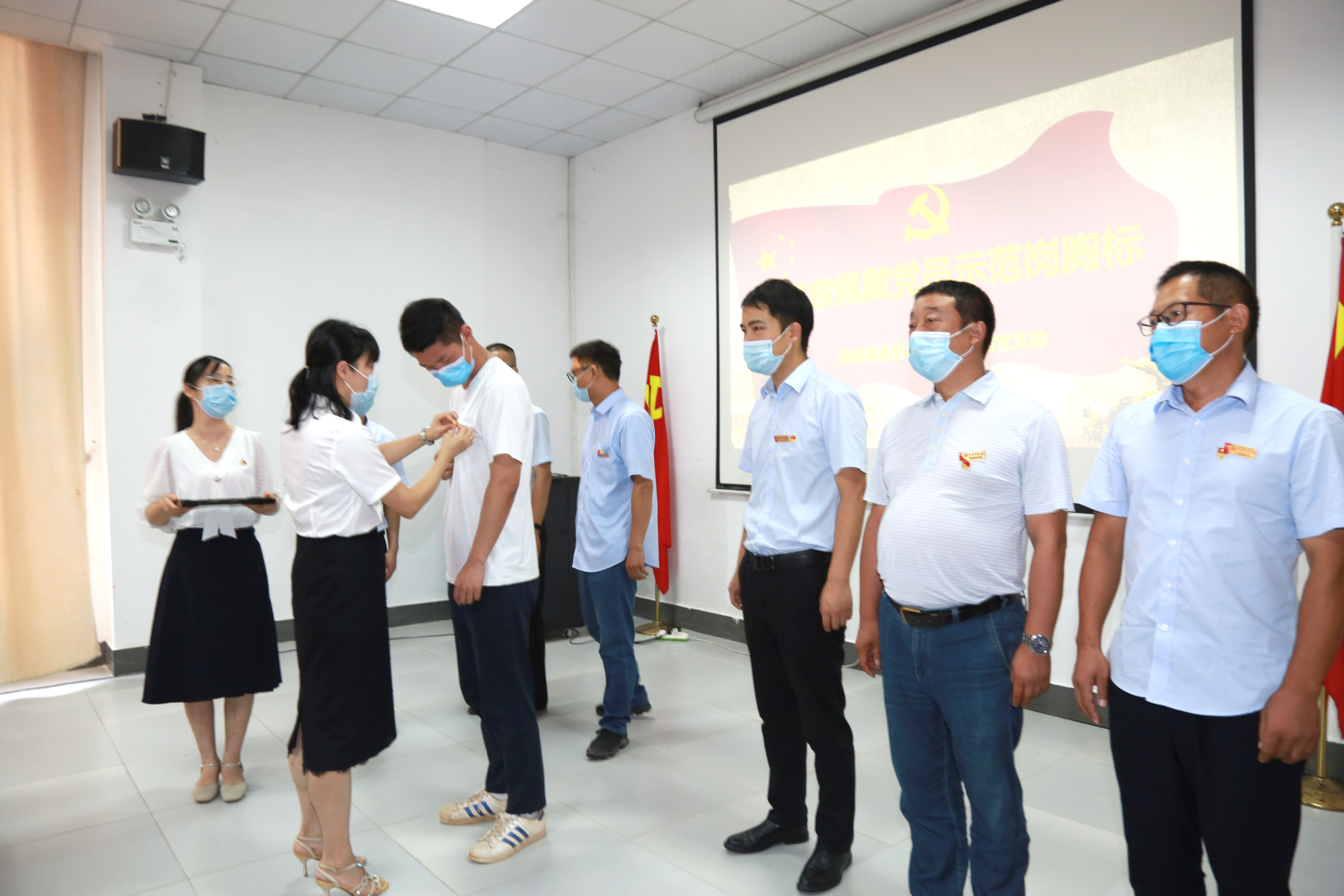 圖:李素英為示范崗黨員佩戴示范崗胸牌
