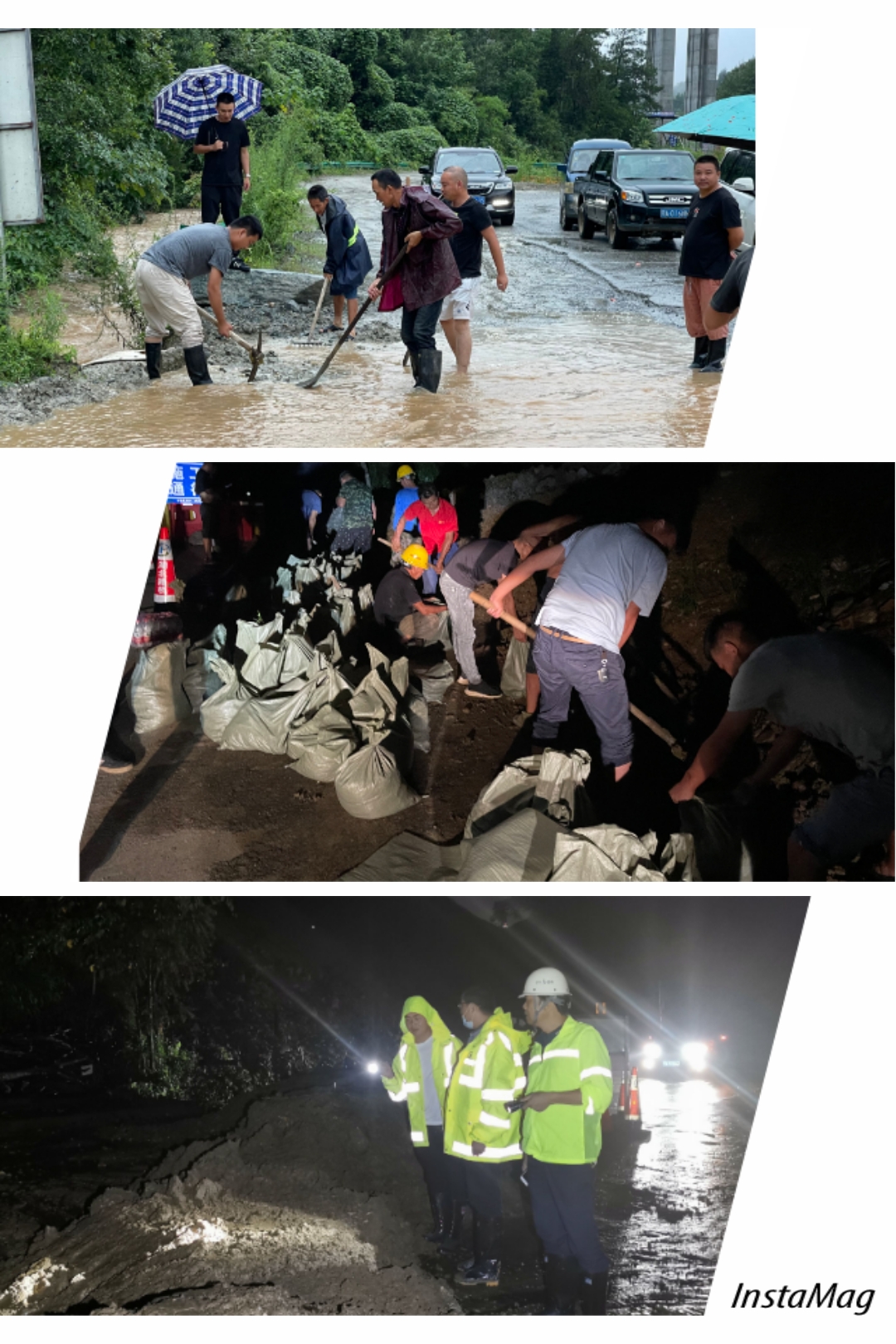 十淅2標項目降雨前深入現場針對排水系統(tǒng)、高邊坡穩(wěn)定性等開展防汛隱患排查,配合政府相關部門對可能發(fā)生重大險情的地段進行三次摸查,重點加強了三清廟大橋、E匝道橋、路基六隊等汛情多發(fā)地的監(jiān)控。暴雨來臨后,十淅項目與時間賽跑,組織工人上足機械設備,建立沙壩防汛搶險,一周內搶通村道十余公里,與地方村委會一同轉移受災群眾十余戶,爭取將當地損失降到最低。