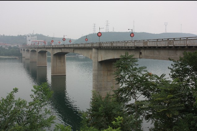 丹江口市二橋:結構型式為(88 2*150 88)m預應力變截面連續箱橋,深水墩最大入水深度40m,居全國同類深水墩大橋之最。2005年建成。