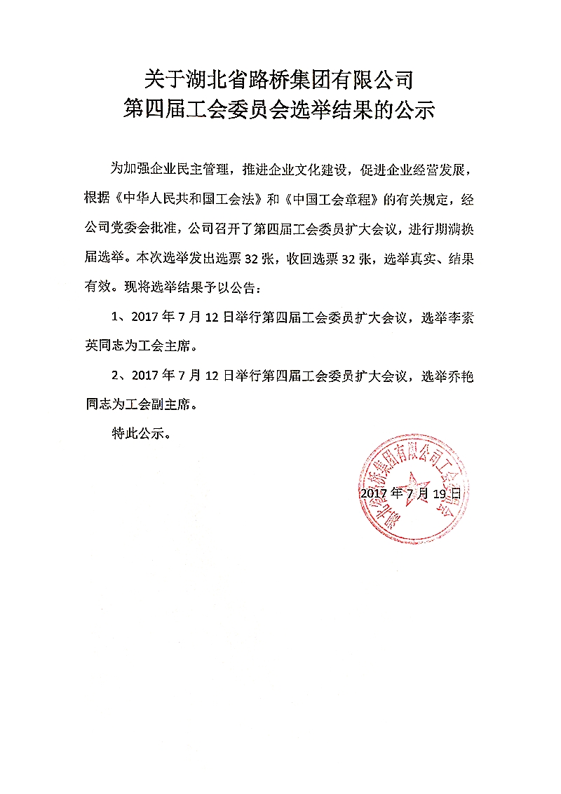 第四屆工會委員會選舉結果的公示
