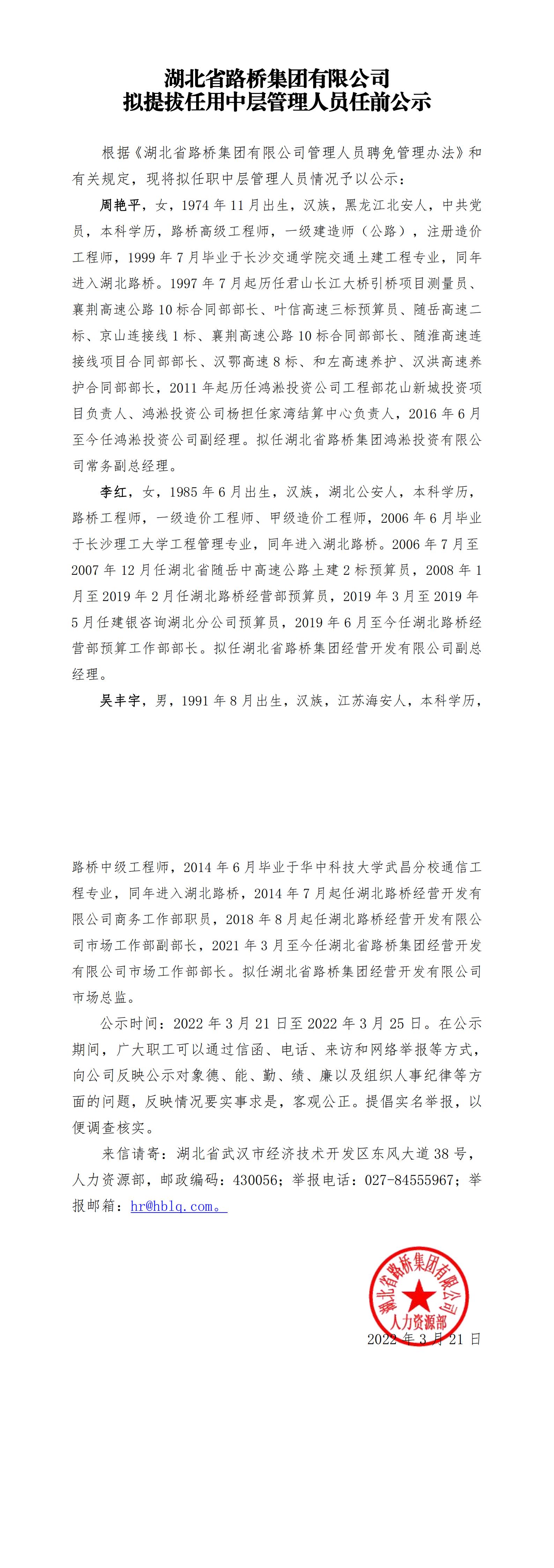 湖北省路橋集團有限公司擬提拔任用中層管理人員任前公示