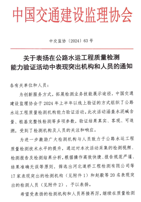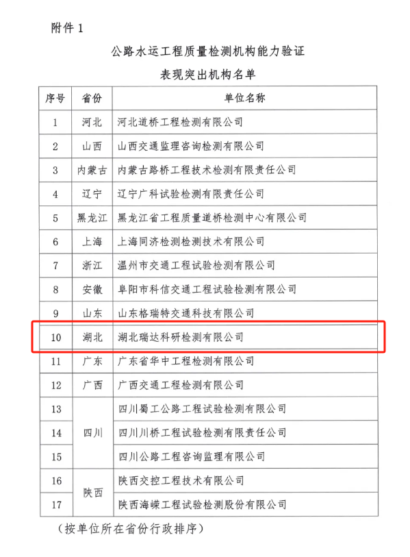 近日,中國交通建設(shè)監(jiān)理協(xié)會發(fā)布《關(guān)于表揚在公路水運工程質(zhì)量檢測能力驗證活動中表現(xiàn)突出機(jī)構(gòu)和人員的通知》,湖北路橋旗下的瑞達(dá)檢測公司榮獲“表現(xiàn)突出機(jī)構(gòu)”稱號,且是湖北省內(nèi)唯一獲得表彰的檢測單位。