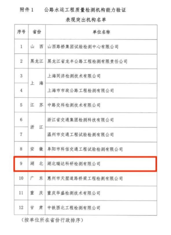 1月9日,中國交通建設監理協會發布表彰通知,聯投湖北路橋瑞達科研檢測公司成功蟬聯第二屆公路水運工程質量檢測能力驗證“表現突出機構”榮譽。成為全省唯一一家連續兩屆獲此榮譽的檢測機構。