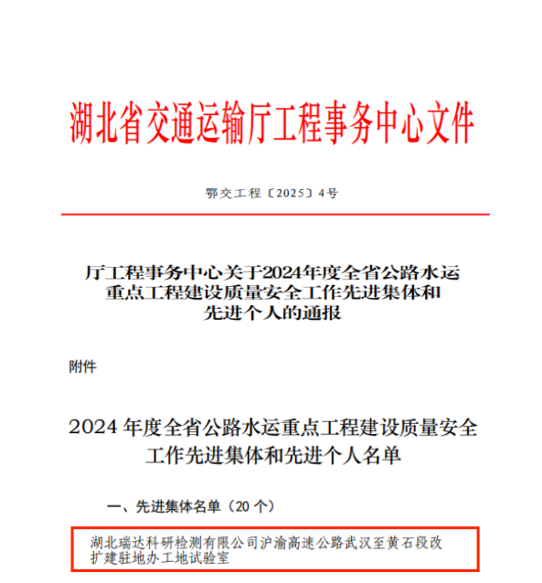 近日,湖北省交通運輸廳工程事務中心發布了《關于2024年度全省公路水運重點工程建設質量安全工作先進集體和先進個人的通報》,瑞達科研檢測公司武黃改擴建高速公路駐地辦工地試驗室在工程建設過程中扎實落實安全質量責任,切實履行檢測機構使命,憑借突出表現榮獲“先進集體”稱號。